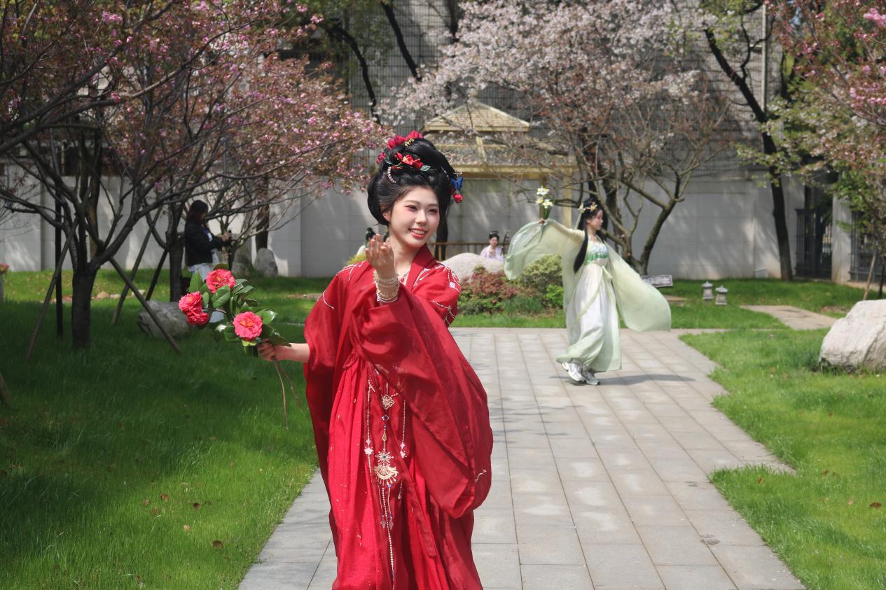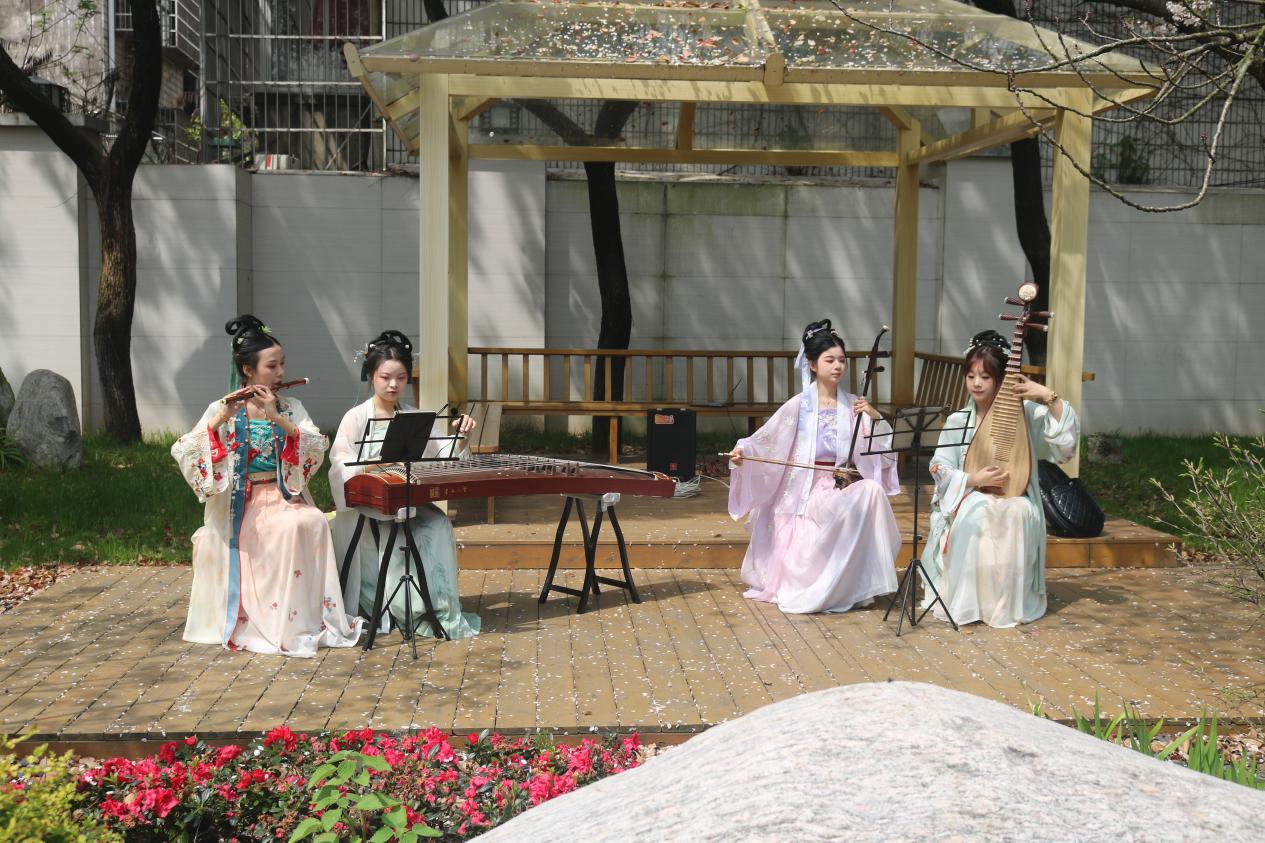 随后,中日学生共赏十二花神主题的汉服走秀。伴随着古筝、二胡、琵琶和竹笛的国风四重奏,十二位花神身着红飞翠舞的精美服饰,踏春而来。中日学生在充满古风韵味的氛围下感受中国传统文化之美。