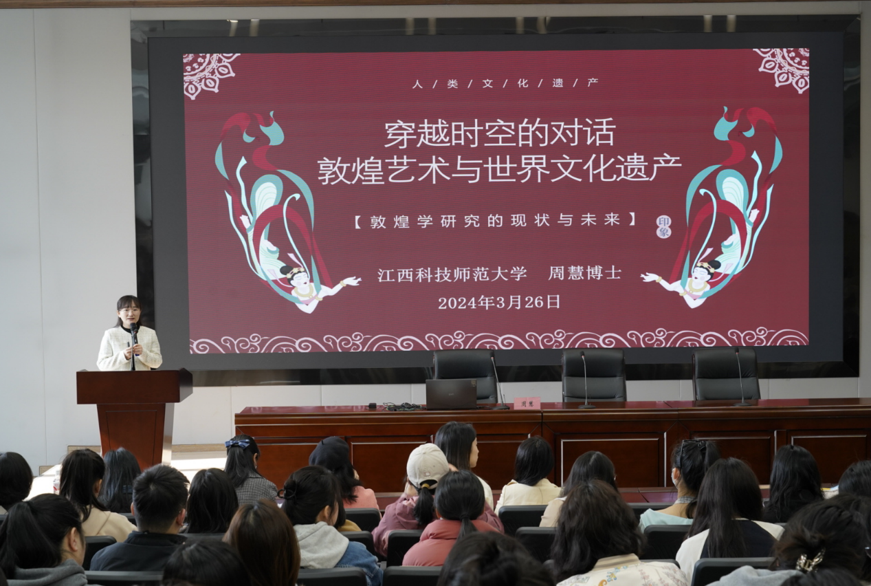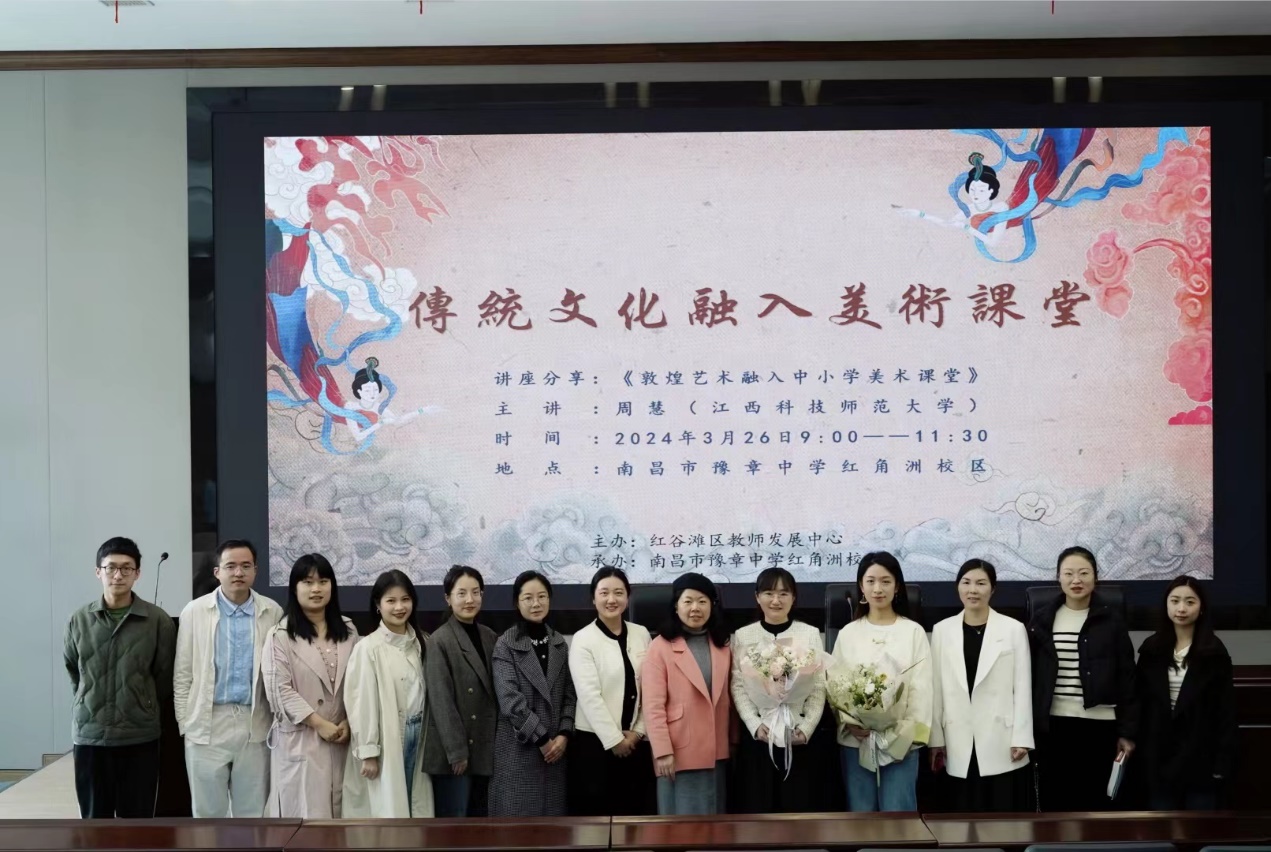 3月26日上午,学校美术学院教师、教师第一党支部书记周慧博士受邀参加红谷滩区中小学美术教研动,为200余名教师做了一场主题为《穿越时空的对话:敦煌艺术与世界文化遗产》的讲座。