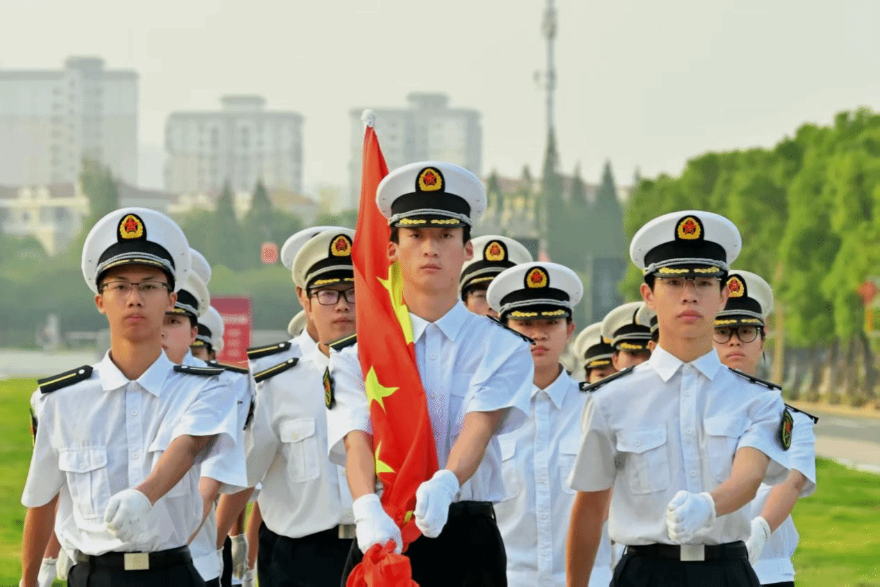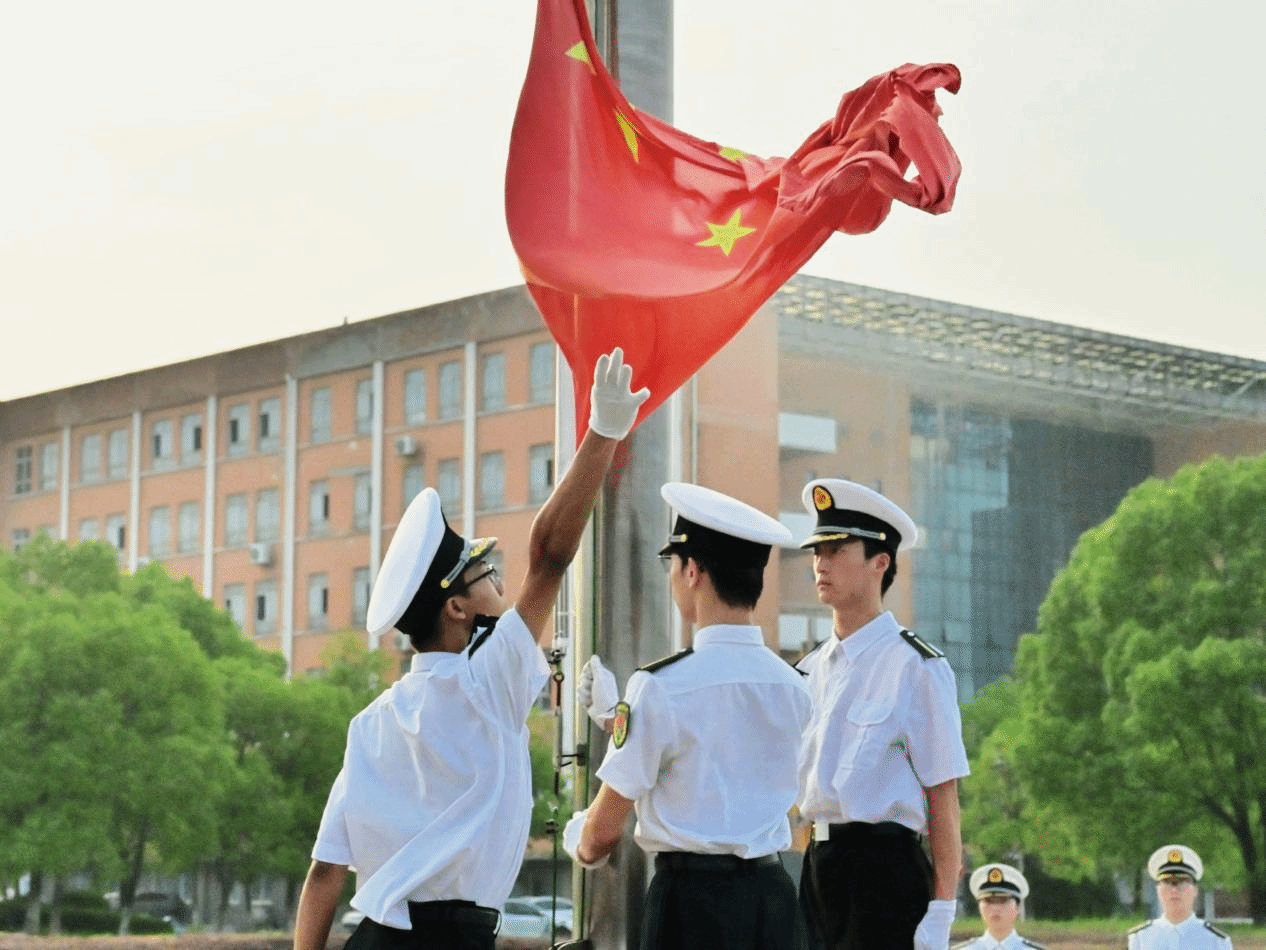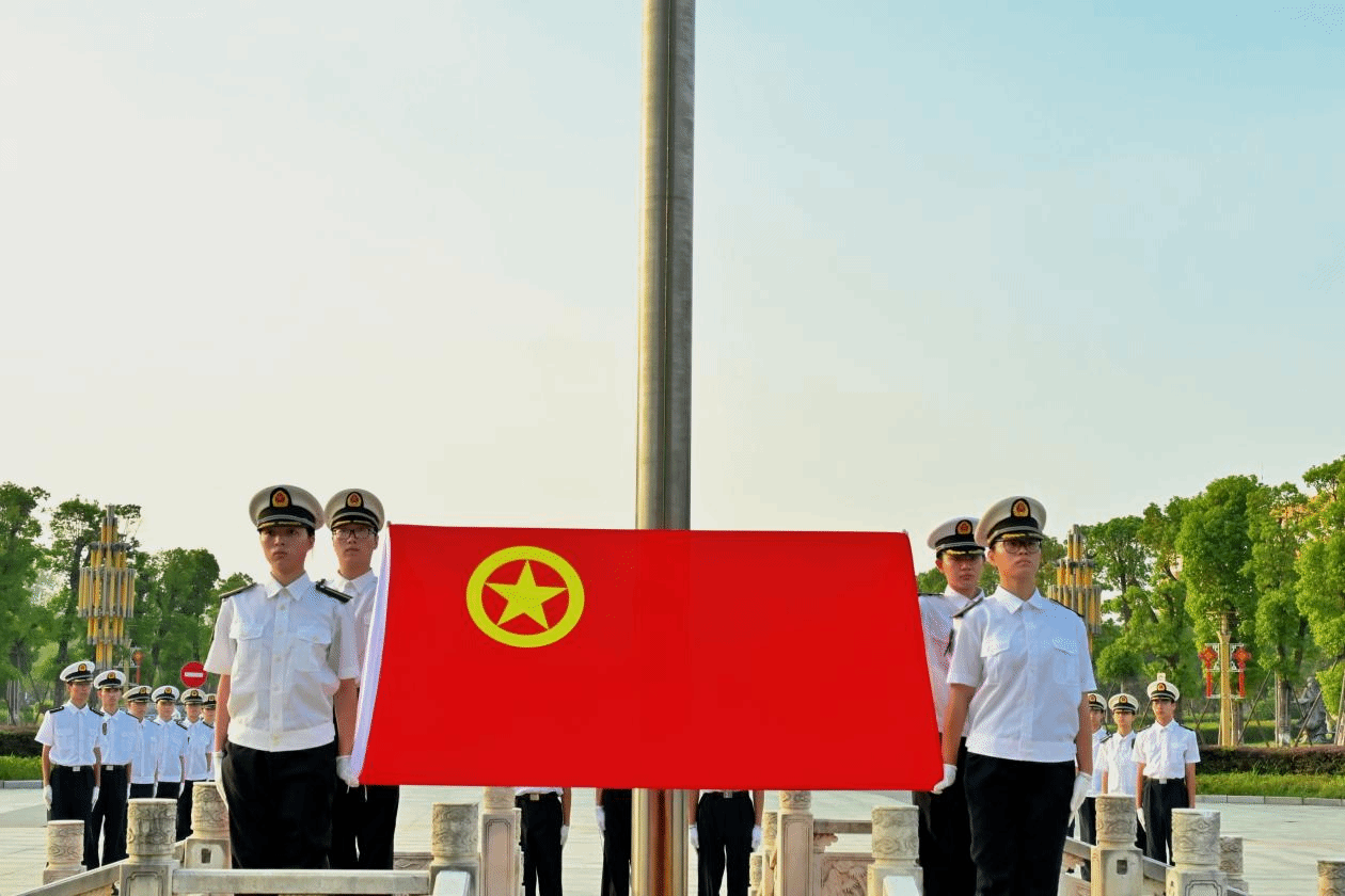 国旗护卫队迈着铿锵有力的步伐,护送国旗入场。伴随着雄壮的国歌,鲜艳的五星红旗在晨风中冉冉升起,全体师生列队肃立,行注目礼。