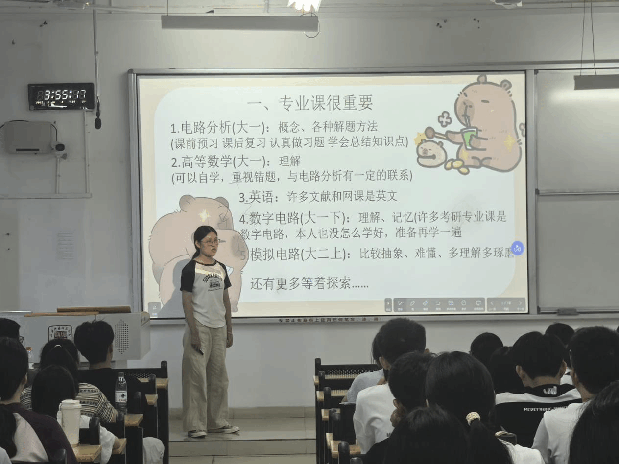 24级电子信息工程专业优秀学生代表李亚轩结合个人经验补充分享。她聚焦专业学习核心,分享电路分析、高等数学、数字电路等课程的学习技巧,如电路分析需“课前预习+课后复习+习题总结”,模拟电路要反复琢磨抽象概念;同时叮嘱新生别滥用自由,不会就问,接受不完美,在劳逸结合中明确考研、就业等目标并付诸行动。