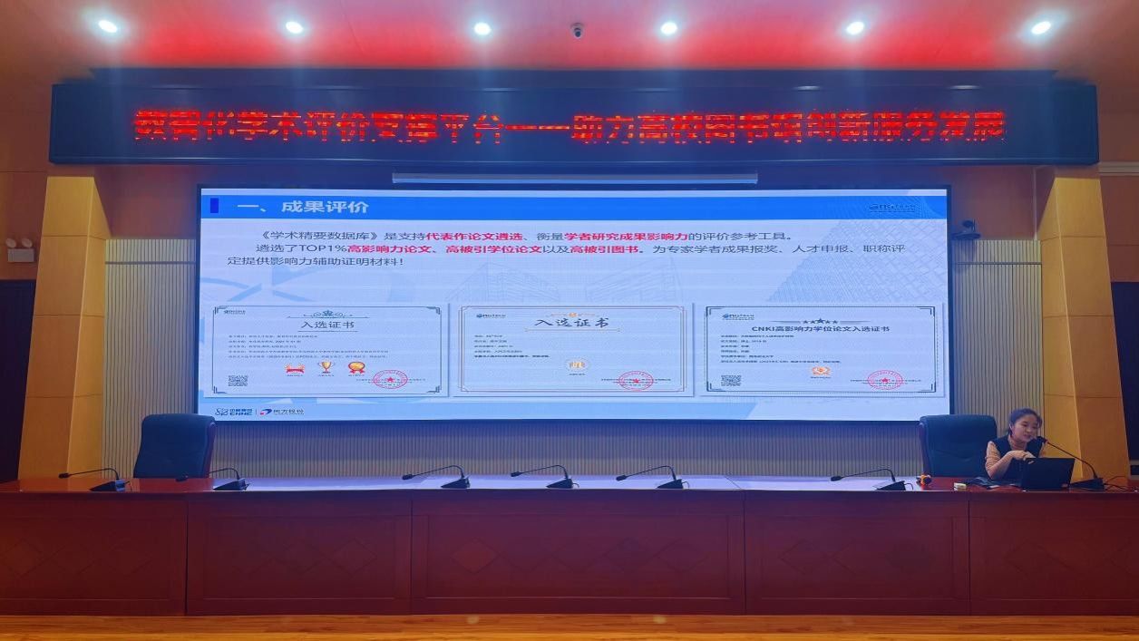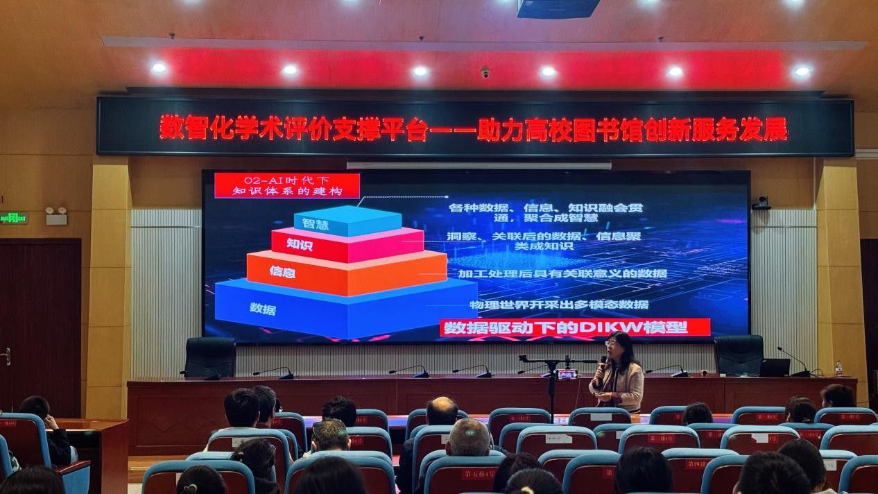 郭小英以“数智化学术评价支撑平台:助力高校图书馆创新服务发展”为题展开分享。她介绍了中国知网旗下中国科学文献计量评价研究中心的基本情况,并结合近年发布的学术评价榜单、代表性论文及学术专著,系统剖析了该平台在支撑科研评价与学术创新中的重要作用。她表示,在人工智能与数智化转型浪潮下,高校图书馆正面临从“资源守护者”向“价值创造者”的深刻转变。通过数智评价赋能,图书馆员得以从繁复事务中解放,将更多精力投入专业判断与智慧服务,推动图书馆从辅助性后台角色,逐步走向前台,成为学校科研管理与决策支持的重要智库。讲座最后,郭小英还进行了平台功能的现场演示。