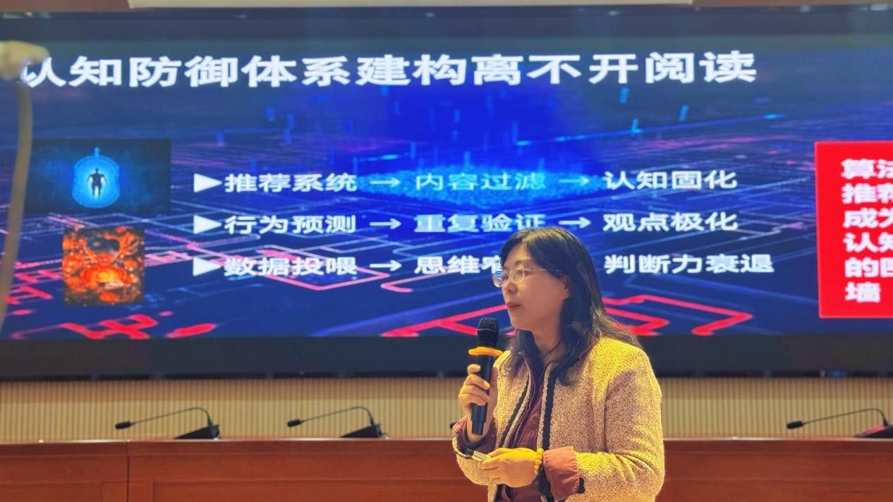 熊英围绕“人工智能背景下的阅读·思考·生活”发表主题演讲。她以“AI时代为何更需要阅读?”“如何运用AI工具实现高效能阅读?”以及“怎样通过阅读构建更有意义的生活?”三个关键问题为主线,层层推进,引导听众展开思辨。熊英表示,面对信息洪流的冲击,唯有通过系统、深度的阅读,才能重构我们的知识体系、增强认知防御能力、提升元认知水平,从而在技术迭代中保持人的主体性与判断力。她结合家庭教育、学校教育与个人成长等多个维度,提出了切实可行的阅读建议,并现场分享了如何利用提示词工程与结构化提问等AI交互技巧,实现更高效、更具深度的“人机共读”。她最后呼吁,在AI日益普及的今天,我们更应珍视并回归阅读的本真价值,以思考照亮生活,用书香涵养心灵。