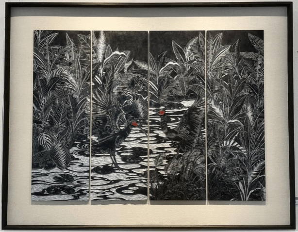 本科生吴琪盼的版画作品《鹮・境》以朱鹮为核心创作题材,通过简洁凝练的构图、层次丰富的肌理效果营造出宁静深远的意境,精准传递出对自然生态的敬畏与思考,展现了过硬的版画创作能力,成功斩获三等奖。