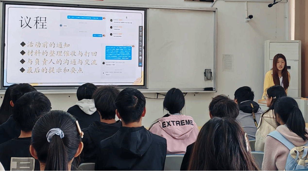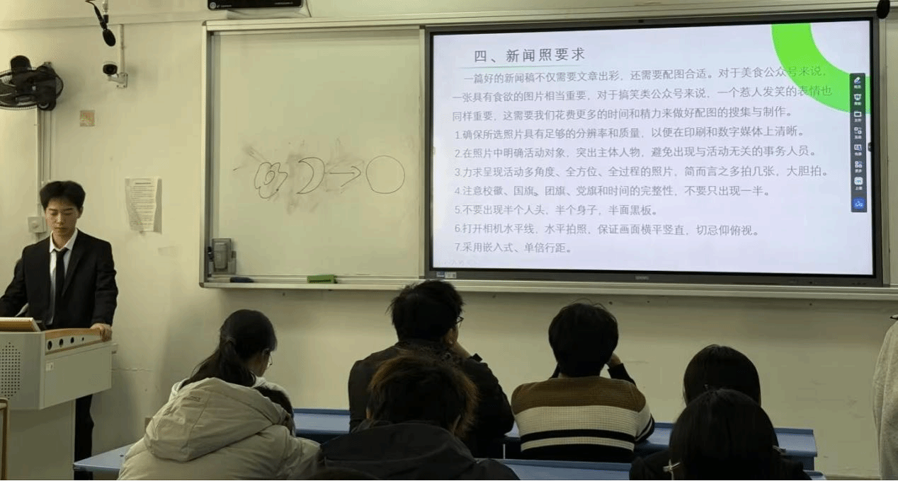培训课程聚焦实操能力,内容针对性突出,贴合工作实际。学科部部长李鑫以“班级事务管理与高效沟通”为主题,结合学生工作实例,从日常事务统筹、信息收集整理、跨部门沟通技巧等多个维度展开分享,为学员提供了可借鉴的组织协调方法。融媒体中心主任刘江屹围绕“新闻稿写作要点”进行系统讲解,涵盖选题立意、结构布局、语言打磨等关键环节,帮助学员构建新闻写作思路。