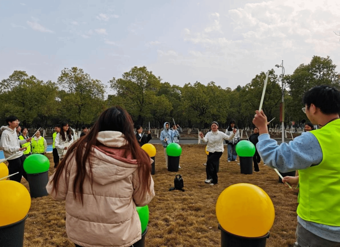 有氧鼓圈区域成为全场“气氛引擎”。在带领者的引导下,同学们随着节奏自由击鼓。鼓声时而激昂、时而轻缓,在集体协作中营造出强烈的情绪共振。许多同学表示:“虽然手臂酸了,但心情格外舒畅。”