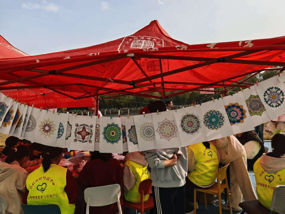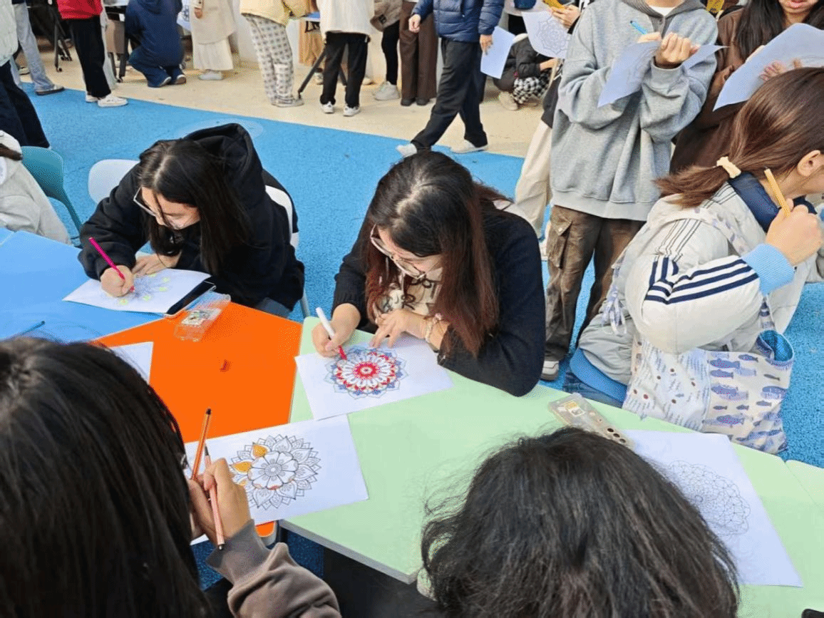 曼陀罗绘画区为大家提供了安静的情绪表达空间。同学们根据当下感受自由选取色彩,或浓郁鲜明,或柔和舒缓,借助图形与颜色的组合,实现内心情绪的直观流露与有序梳理。