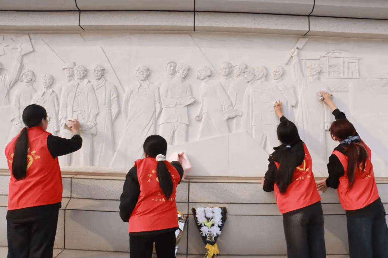 团员青年们化身“英烈守护者”,在烈士雕塑前开展清洁志愿活动。他们俯身轻拭基座上的英烈姓名,踮脚拂去雕塑高处的尘埃,动作轻柔而坚定;擦拭间隙,大家轻声探寻雕塑背后的英雄事迹,让平凡的劳动化作一场跨越时空的精神对话,更让“守护英烈”的信念,从赤诚初心变为躬身践行的使命担当。
