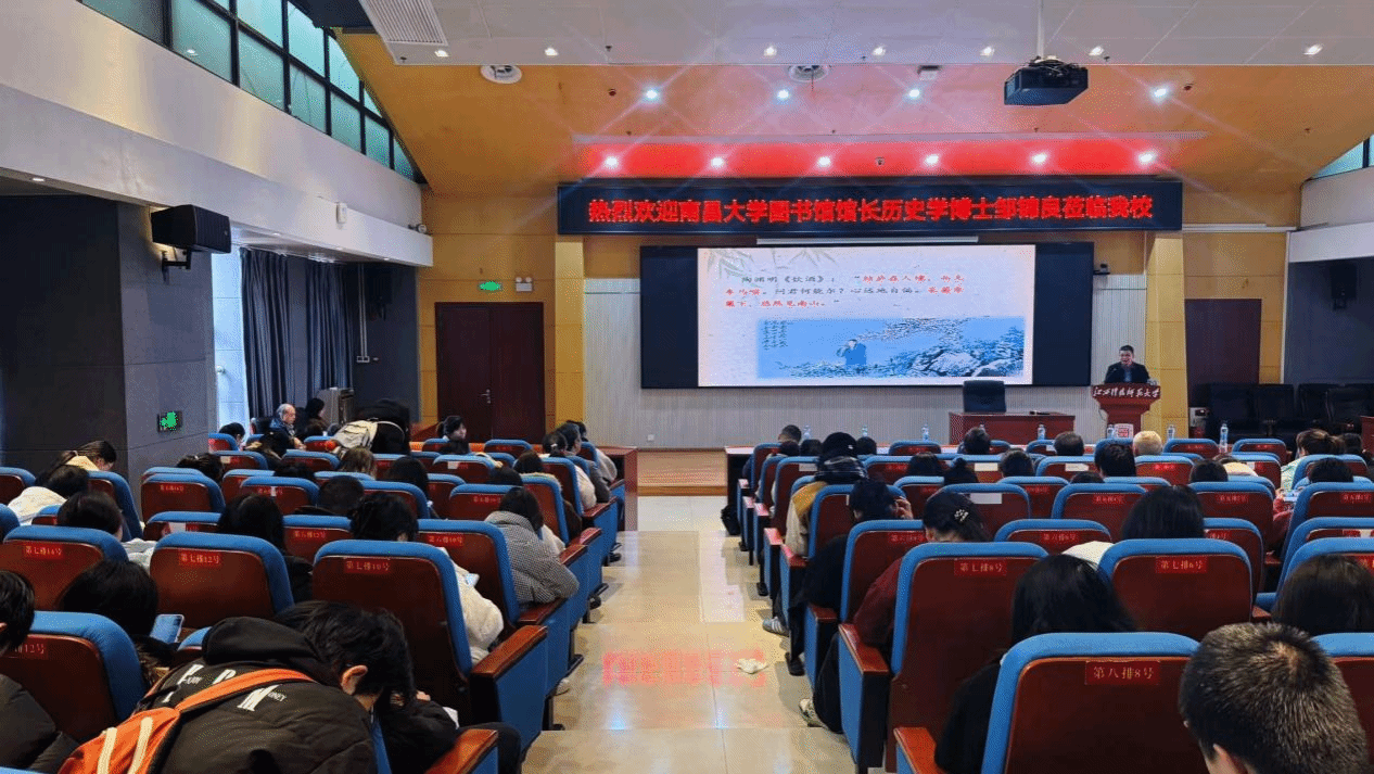 12月16日下午,红角洲校区图书馆950报告厅,南昌大学图书馆馆长、历史学博士邹锦良应邀来校作“古籍里的江西文化”专题讲座。图书馆馆长熊英主持,副馆长朱建春、黄弋芸出席。200余名师生到场聆听。