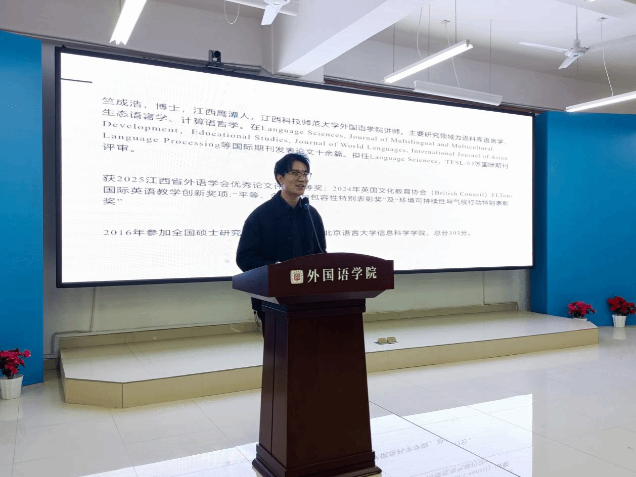 竺成浩从自身教学与成长经历出发,围绕语言能力提升、师范技能培养、心理疏导方法及职业就业认知四个方面展开分享。他表示,听说能力是外语学习的核心,师范类专业同学需主动参与教学实践,打磨教学设计、课堂管理等技能。面对学业焦虑,要学会拆解目标,培养自我心理疏导能力。他分析了外语专业理想职业与行业就业的现实差距,鼓励同学们立足当下,夯实专业功底,以多元技能适配市场需求。