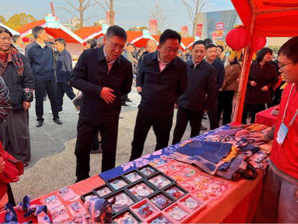 由工作室自主设计与研发的系列教学衍生文创产品也在此次市集中精彩亮相。产品融合非遗技艺与当代设计语言,备受观众喜爱,现场展品几乎售罄。我院项目的展示也引起了省文化和旅游厅副厅长韩之宇、上饶市相关领导及省非遗处负责人的关注与肯定,成为非遗活态传承与创新转化的生动案例。