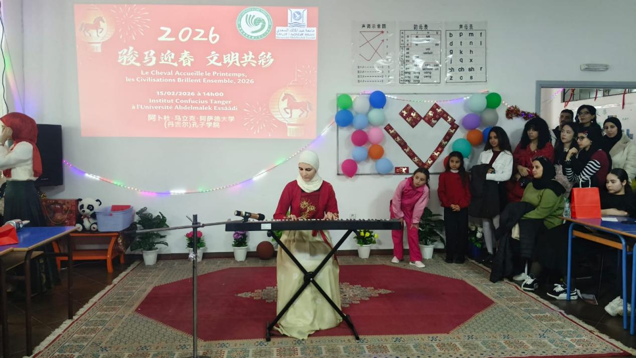 祥龙贺岁福满门,骏马迎春乐无疆。在2026年新春佳节即将来临之际,阿卜杜·马立克·阿萨德大学孔子学院(丹吉尔孔子学院)张灯结彩、喜气洋洋,一场以“骏马迎春,文明共彩”为主题的春节晚会在此举行。