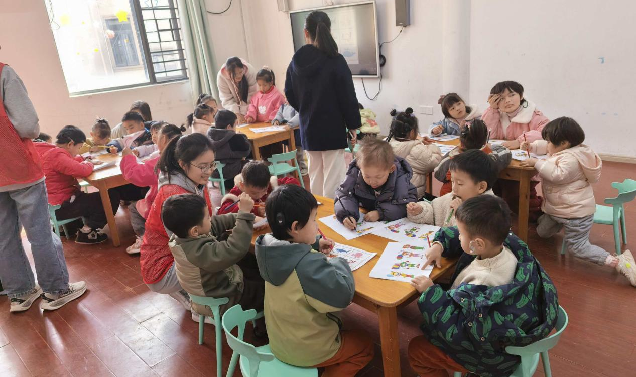 在“听令绘画,手眼协同”环节,孩子们根据指令在准备好的图画上进行创作。这一游戏不仅有助于锻炼孩子们的听觉和动作协调能力,还能在互动中提高孩子们对指令的理解能力,提升手眼耳协调配合能力。此外,志愿者们还为孩子们准备了色彩鲜艳、图案简单的拼图,完成示范后,志愿者引导孩子们自主尝试完成拼图。