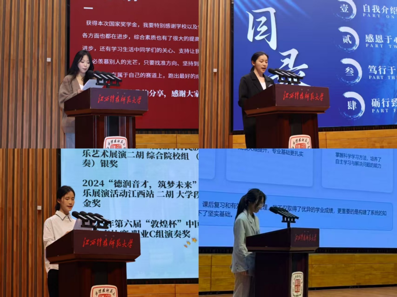 获奖学生代表依次上台,分享了自己的成长经历与奋斗故事。他们从专业学习、艺术实践、志愿服务、学业规划等多个维度,讲述了自己在逐梦路上的坚持与突破,分享了平衡学业与实践、克服困难的宝贵经验,用真实的经历、真挚的感悟,为在场同学带来了一堂生动的励志课,引发了全场师生的强烈共鸣。