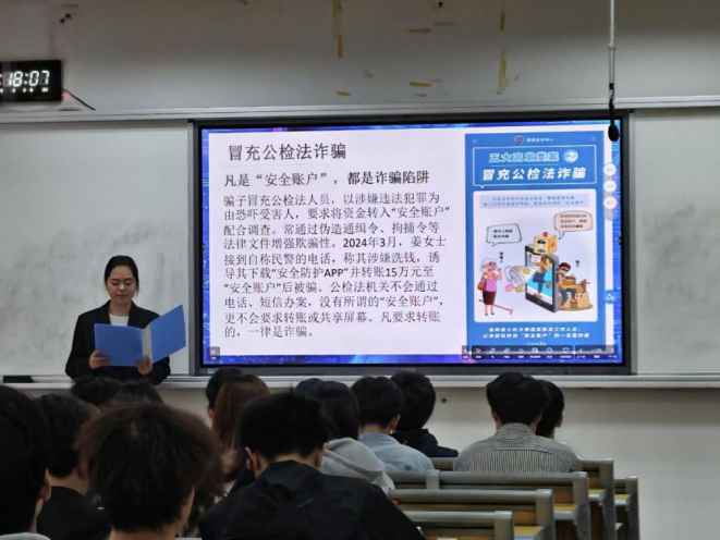 宣讲团成员没有照本宣科,而是结合近期高发的真实案例,拆解了冒充公检法、网络购物退款、虚假投资等几类常见诈骗套路。他们详细讲述了本校学生遭遇的刷单返利、游戏账号交易、冒充同学借钱等真实经历,这让在场同学感触很深,不少人小声议论:“原来这些事就发生在我们身边。”