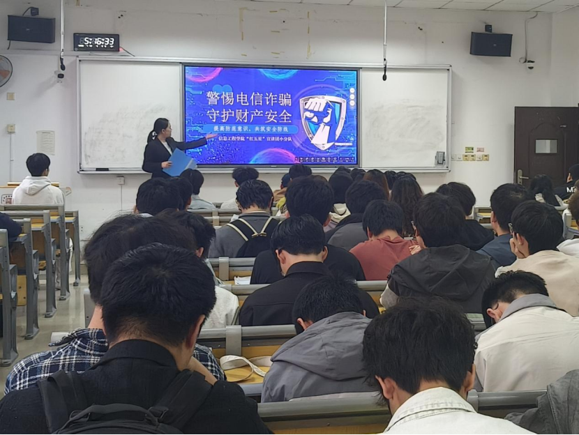 4月22日,信息工程学院“红五星”宣讲团小分队以“警惕电信诈骗,守护财产安全”为主题,开展了一场面向全院学生的反诈宣讲。
