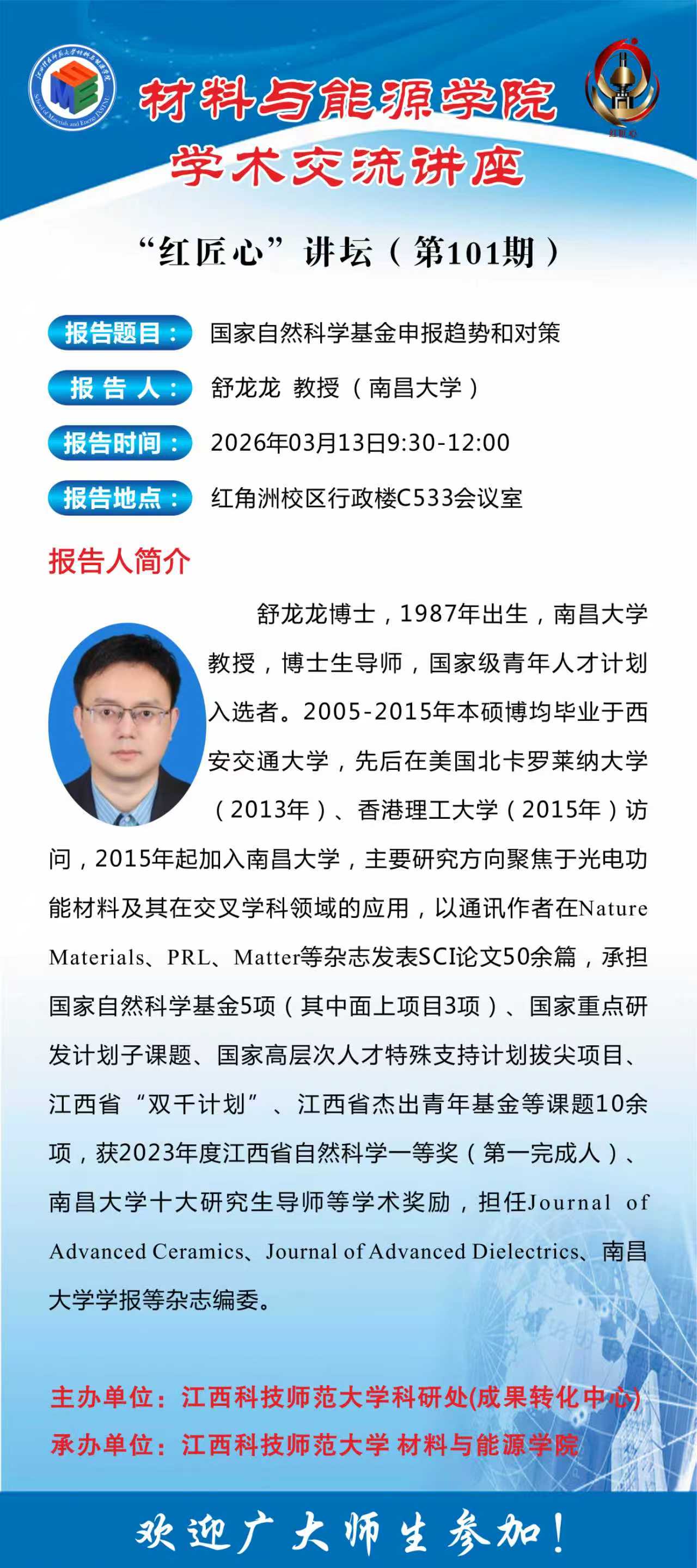 【“红匠心”讲坛】第101期:舒龙龙:国家自然科学基金申报趋势和对策
